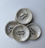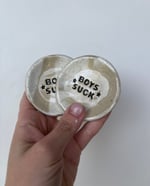 Because sometimes you just need your ceramics to say what you’re thinking. These little handmade ring dishes are stamped with BOYS SUCK (and yes, they really do), making them the perfect spot to toss your jewels, or tiny treasures.